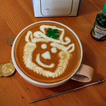 Afterwards, pour another 5 leaf Rosetta, this time starting above the Rosetta on the left of the cup on a slight upward angle towards the centre of the cup. These two will be Leprechauns 'eyebrows'