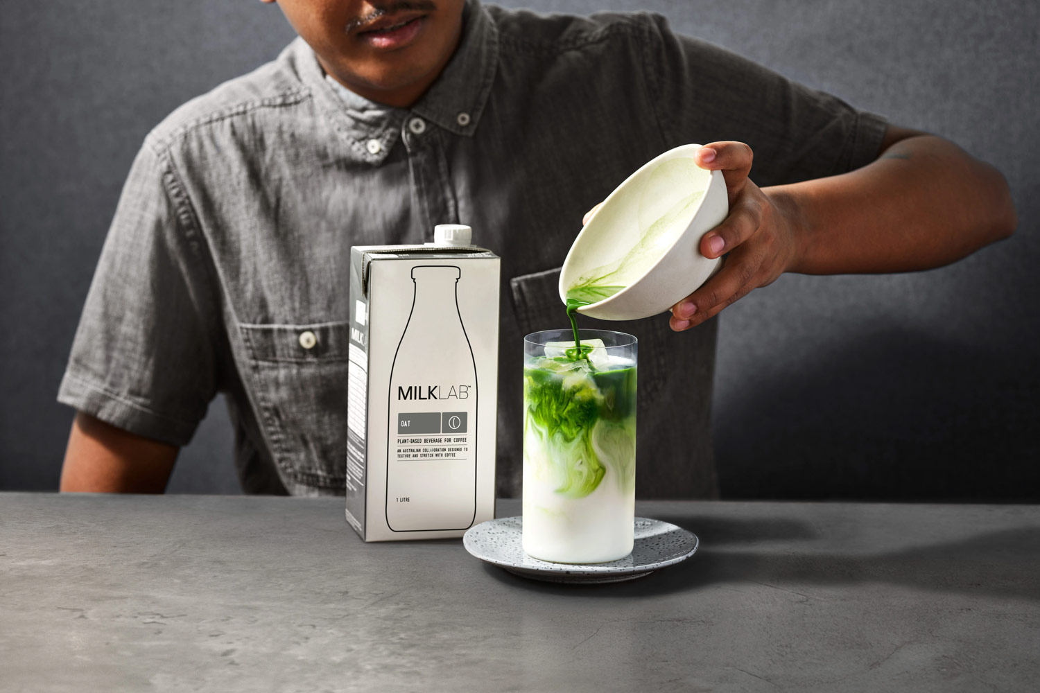 - Fill the cup with ice, your choice of MILKLAB, vanilla syrup and double shot of espresso.